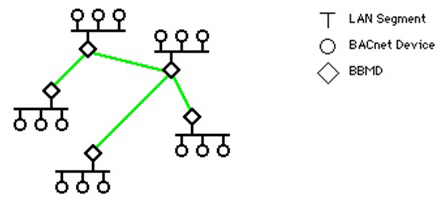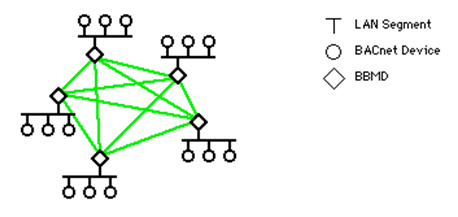 為了確保廣播消息不會(huì)在所有子網(wǎng)中路由,引入了BACnet廣播管理設(shè)備(BACnet Broadcast Management Device,BBMD)。很多功能,比如動(dòng)態(tài)name綁定、值改變通知都會(huì)廣播,通過(guò)BBMD把這些消息限制在各自的網(wǎng)絡(luò)中。